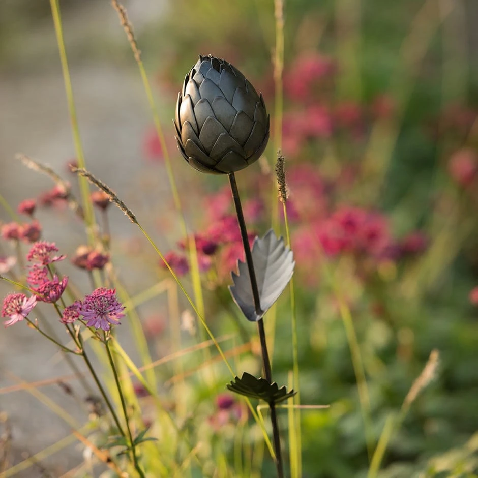 Please note: these individually handmade and finished stakes may include some sharp points or edges. Take care when unpacking and assembling them and position in a quiet spot off the beaten track. When pushing the stake into hard ground, hold the stem and push. Do not put all your weight on the artichoke.