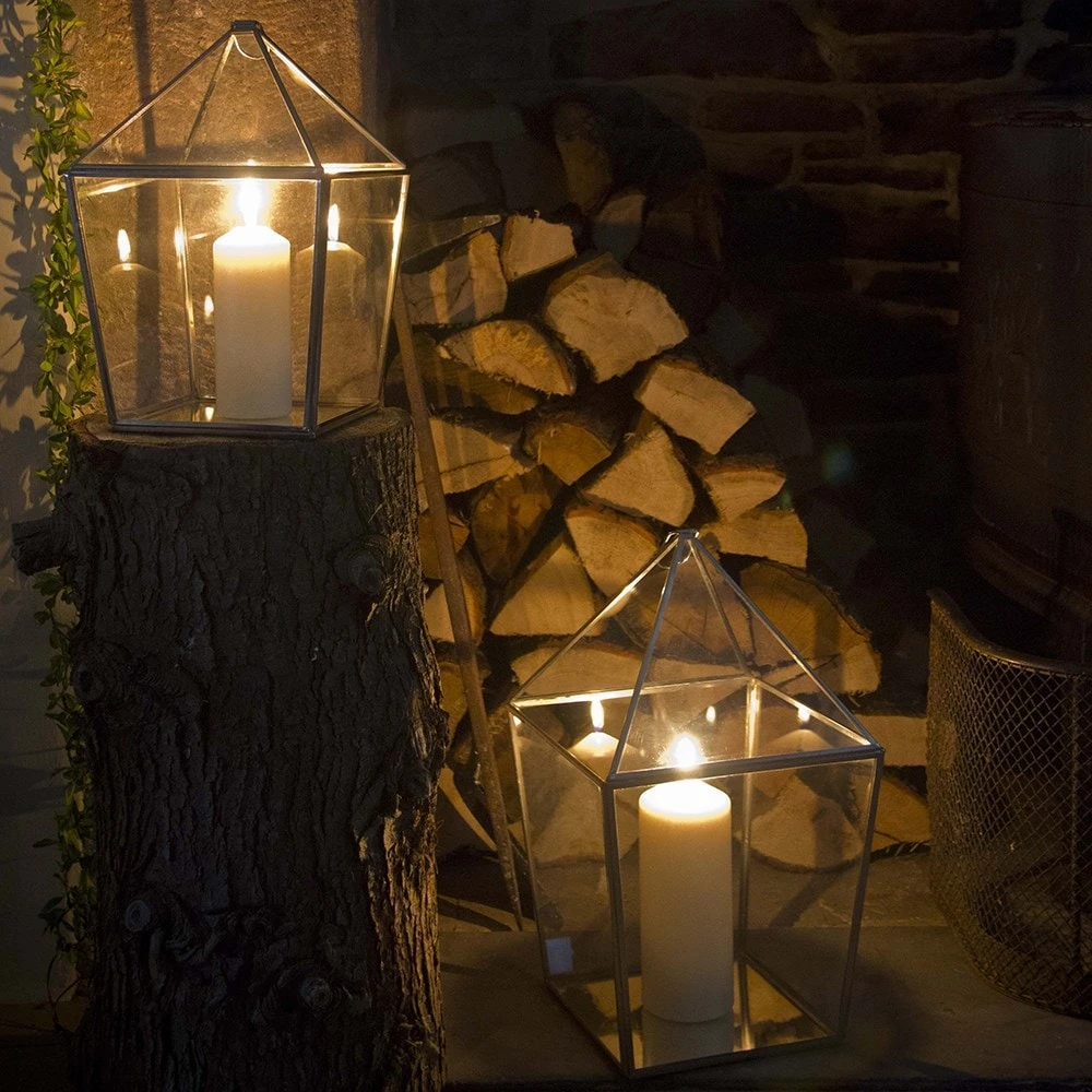 Made from nickel-plated brass, these were inspired by old railway lanterns. They include a mirrored base to gleam in the light. Great for creating a warm, cosy feel and suitable for free standing or hanging use, indoors or out.