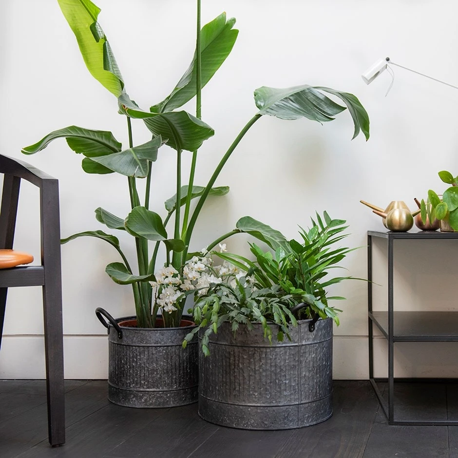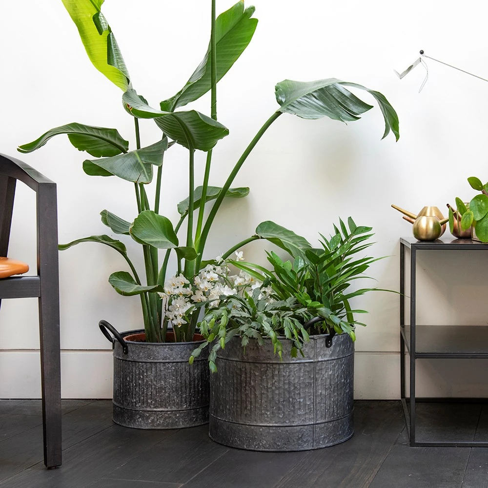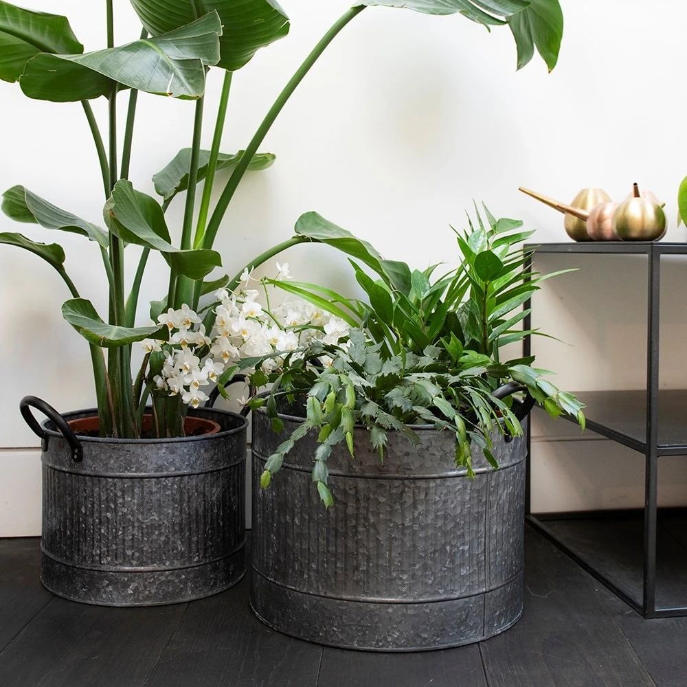 Pair of round galvanised steel ribbed planters with blackened handles, reminiscent of traditional Victorian tin baths. These two different sized pots look great grouped together brimming with a mix of plants, creating a miniature garden.